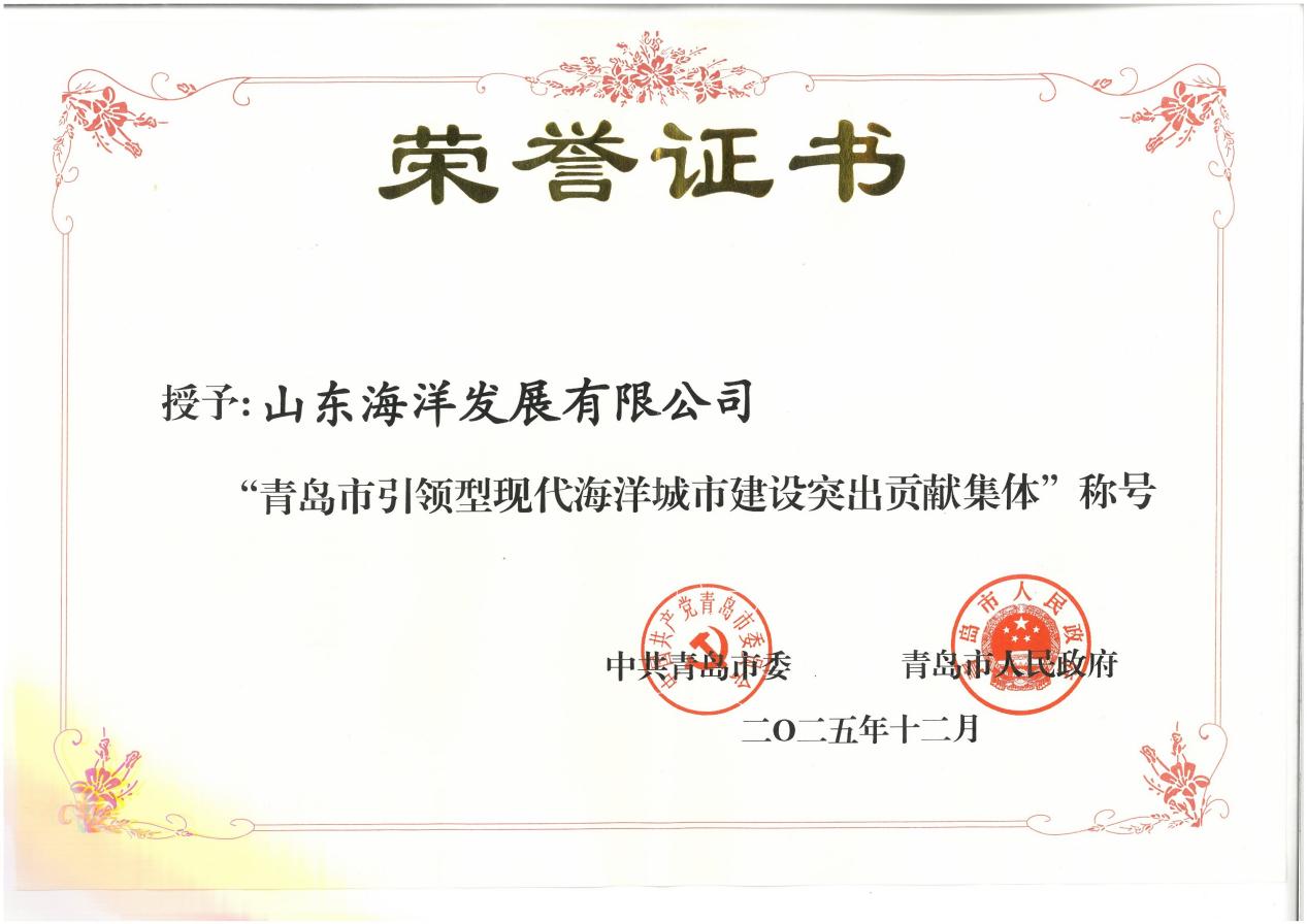 近日,青岛市引领型现代海洋城市建设突出贡献集体和个人评选表彰结果正式公布,山东海洋发展有限公司成功获评“青岛市引领型现代海洋城市建设突出贡献集体”。